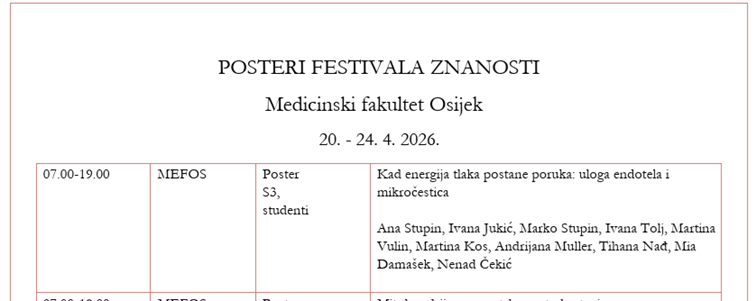U sklopu Festival znanosti 2026, čija je ovogodišnja tema bila „Energija“, na Medicinski fakultet Osijek predstavljen je poster pod nazivom „KAD ENERGIJA TLAKA POSTANE PORUKA: ULOGA ENDOTELA I MIKROČESTICA“.