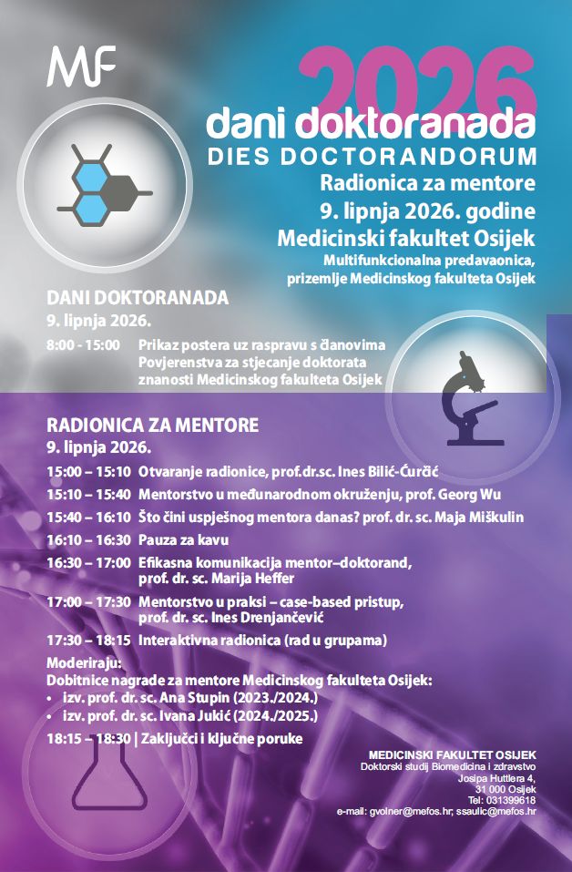 Dana 9. lipnja 2026. godine održat će se dvanaesti po redu Dani doktoranada, manifestacija na kojoj studenti 2. i 3. godine Doktorskog studija Biomedicina i zdravstvo javno prikazuju rezultate svojih istraživanja.