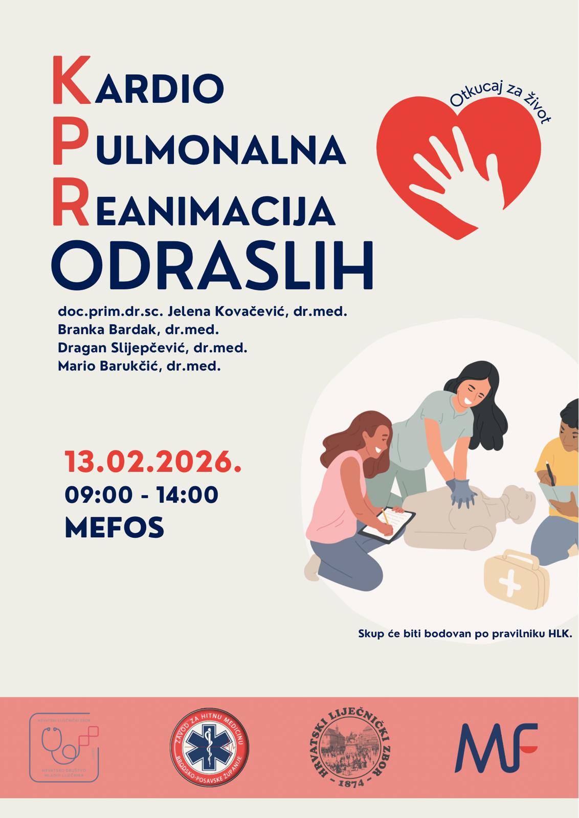 ozivamo Vas na novo predavanje i radionicu u organizaciji HDML Osijek, HLZ Osijek, ZHM Brodsko-posavske županije i Medicinskog fakulteta Osijek na temu „Kardiopulmonalna reanimacija odraslih”, koje će se održati u petak, 13. veljače 2026., na Medicinskom fakultetu Osijek, s početkom u 9 sati. Naš tim predavača i voditelja radionica činiti će doc. prim. dr. sc. Jelena Kovačević, dr. med., Branka Bardak, dr. med., Dragan Slijepčević, dr.med i Mario Barukčić, dr.med.