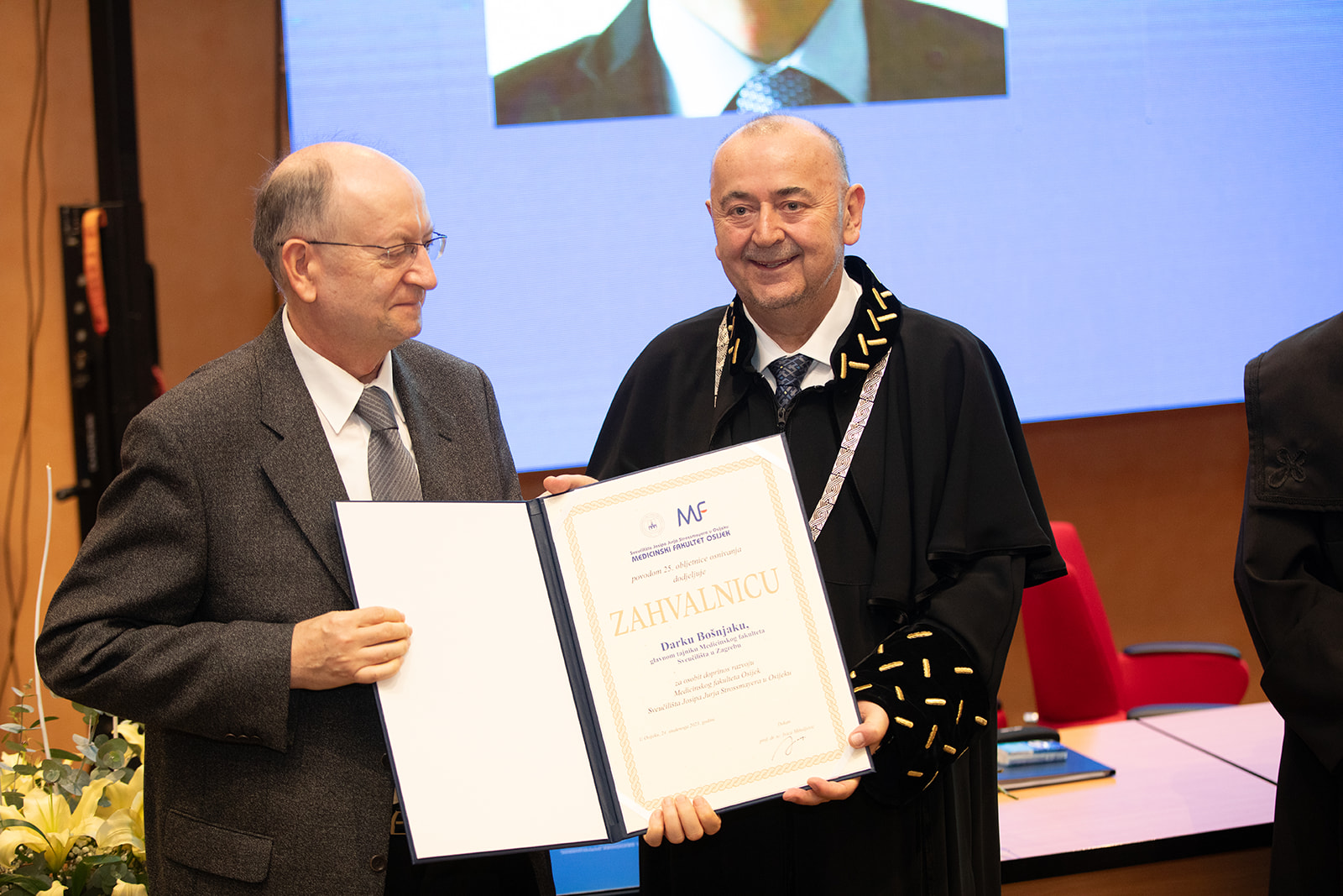 Svečana proslova 25. obljetnice osnutka Medicinskog fakulteta u dvorani Nadbiskupskog vikarijata u Osijeku okupila je gotovo 400 gostiju, izaslanika Predsjednika Hrvatskog sabora, izaslanika Predsjednika Vlade Republike Hrvatske, zastupnika u Hrvatskom saboru, državnih dužnosnika, biskupa đakovačko-osječkog, akademika, rektora, prorektora, dekana, prodekana, profesora, nastavnika, djelatnika, studenata, alumnija, te prijatelja Medicinskog fakulteta Osijek. Nakon pozdravne riječi dekana Fakulteta prof. dr. sc. Ivice Mihaljevića, slijedili su prigodni govori zamjenice gradonačelnika Grada Osijeka gospođe Jasenke Crnković, župana Osječko-baranjske županije gospodina Mate Lukića, akademika Ivice Kostovića, počasnog doktora znanosti Sveučilišta Josipa Jurja Strossmayera u Osijeku prof. dr. sc., prof. h. c. Dragana Primorca, rektora Sveučilišta Josipa Jurja Strossmayera u Osijeku prof. dr. sc. Vlade Guberca, u ime Predsjednika Hrvatske akademije znanosti i umjetnosti akademika Zvonka Kusića, državnog tajnika Ministarstva znanosti i obrazovanja gospodina Ivice Šuška, te izaslanika Predsjednika Vlade Republike Hrvatske gospodina Tomislava Dulibića, državnog tajnika u Ministarstvu zdravstva. Nakon pozdravnih govora prikazan je film o Medicinskom fakultetu Osijek čiju je realizaciju pomogla Akademija za umjetnost i kulturu Sveučilišta u Osijeku. U ime Uredničkog odbora Monografije Medicinskog fakulteta Osijek izdane povodom obilježavanja 25. obljetnice samostalnog rada Fakulteta, prof. dr. sc. Ines Drenjančević, prodekanicu za znanost Fakulteta, predstavila je ovo vrijedno djelo koje je u 475 stranica saželo put rasta i razvoja Fakulteta, te predstavilo što Medicinski fakultet Osijek predstavlja danas. Svečana proslava 25. obljetnice Medicinskog fakulteta Osijek popraćena je dodjelom povelja, plaketa i zahvalnica zaslužnim institucijama, ustanovama i pojedincima za izniman doprinos i zasluge za osnivanje i razvoj Medicinskog fakulteta Osijek, za dugogodišnju uspješnu suradnju s Fakultetom te za istaknut rad na Fakultetu. Svečanost su svojim glazbenim programom uveličali Vokalni ansambl Brevis pod vodstvom dirigentice prof. art. dr. sc. Antoanete Radočaj-Jerković, te slavonski Tamburaški sastav Taman.